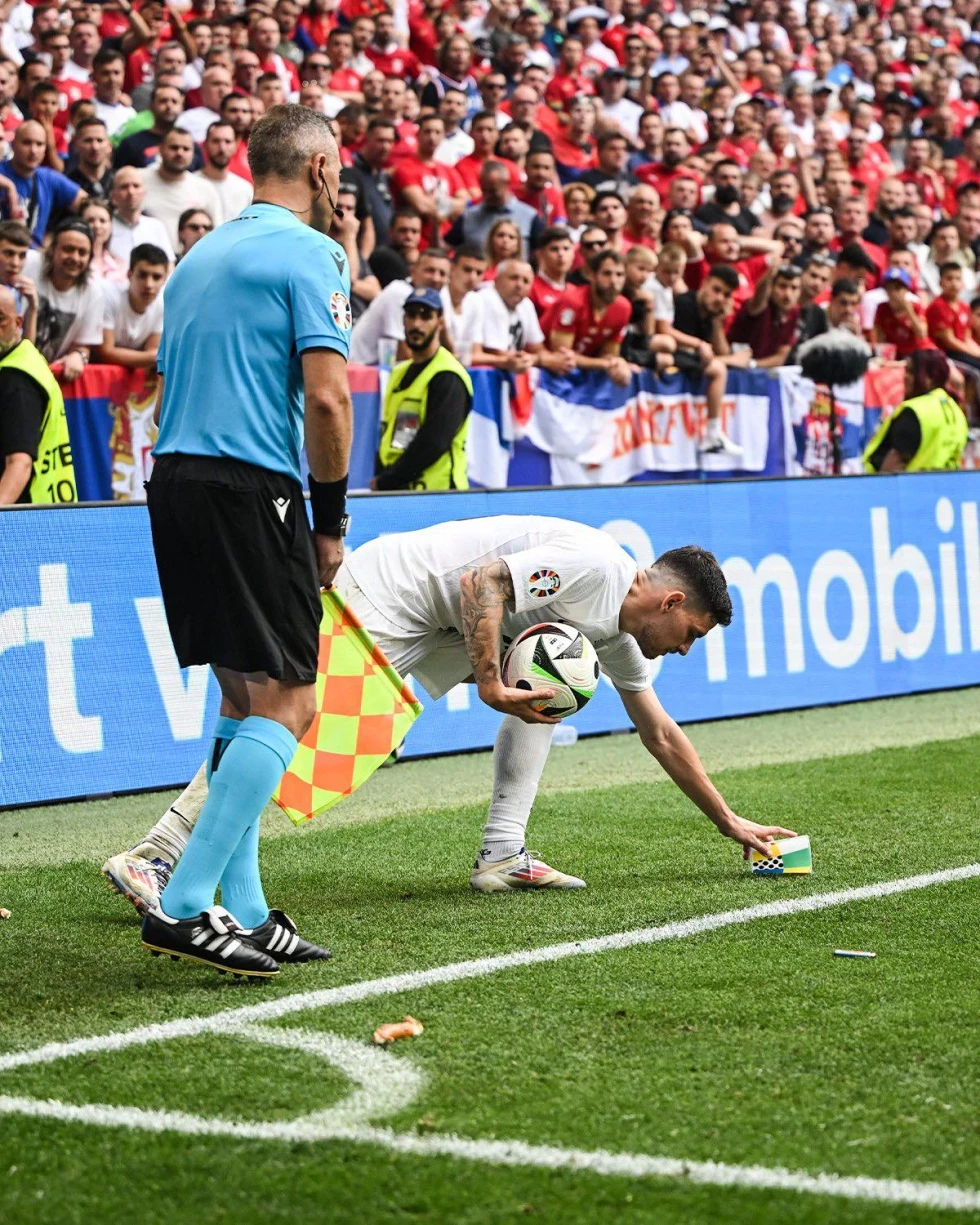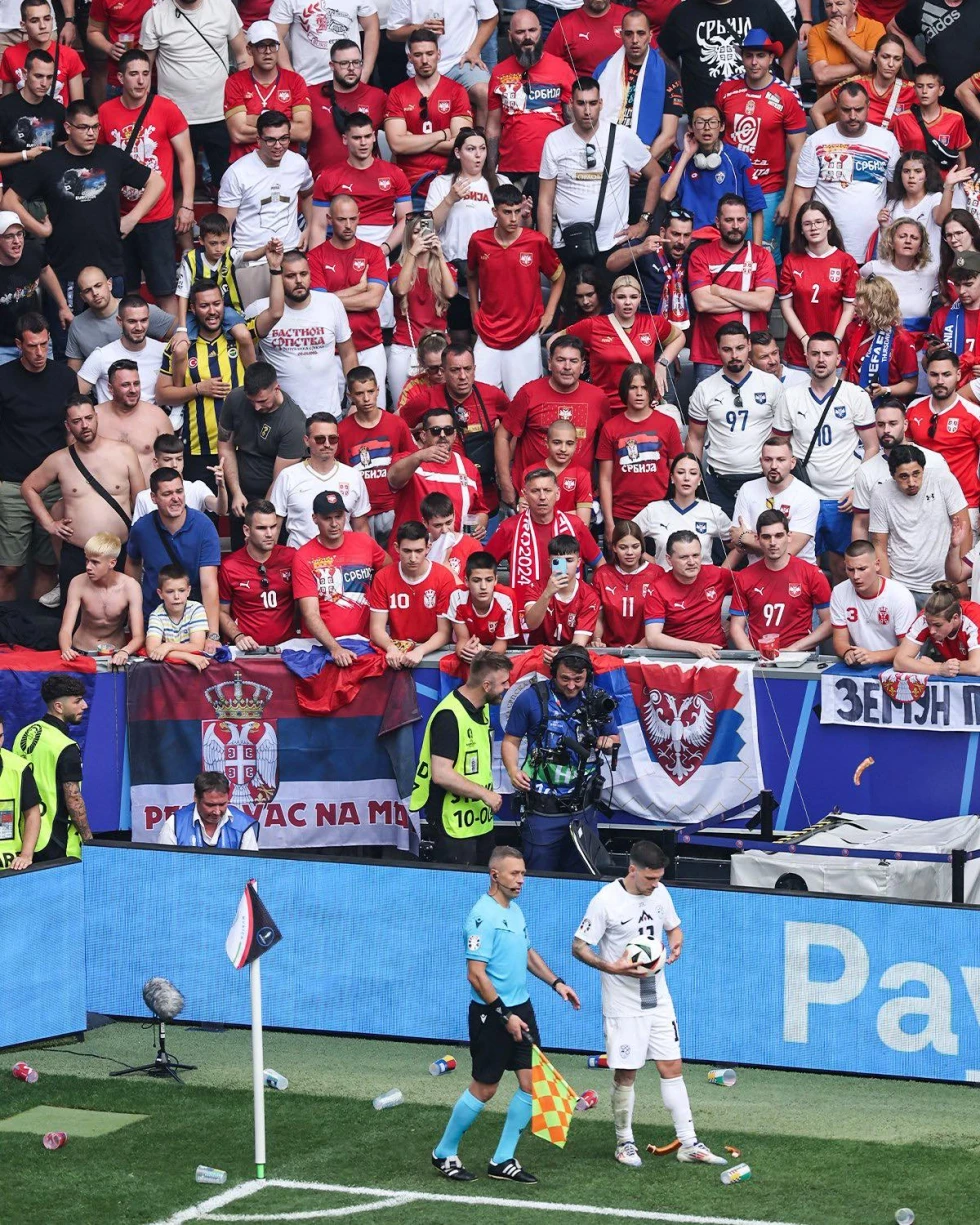 Tifozët serbë në pjesën e dytë nuk kanë ndalur hedhjet në fushën e lojës.