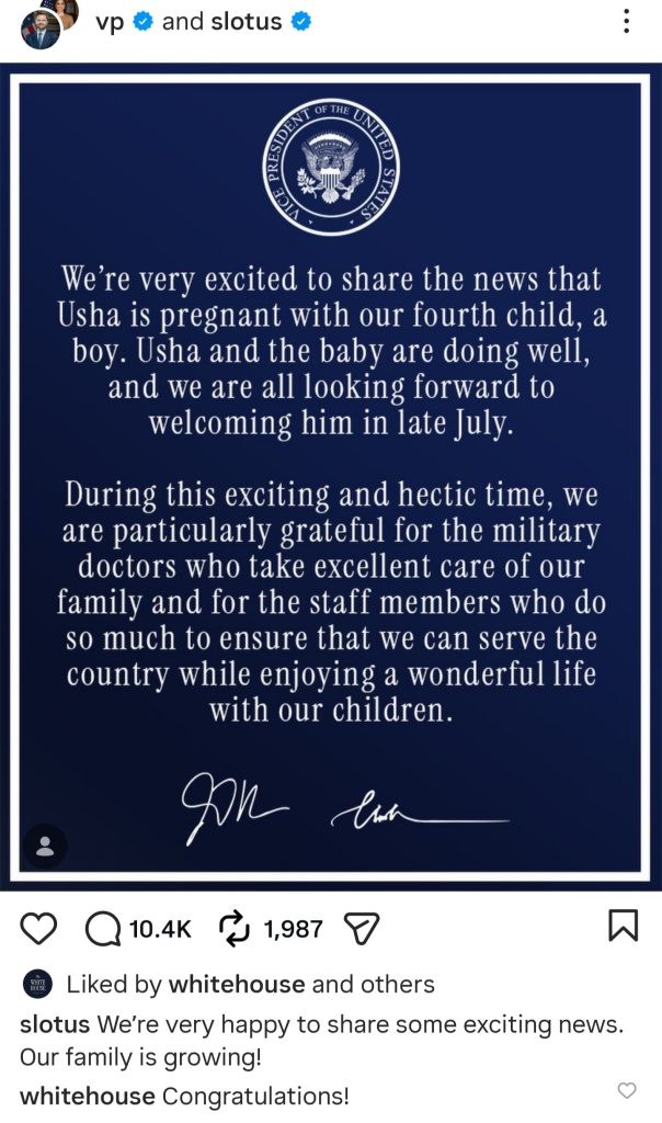 Zëvendëspresidenti i Shteteve të Bashkuara dhe bashkëshortja e tij, Usha, kanë njoftuar se familja e tyre do të zgjerohet së shpejti. Përmes një postimi të përbashkët në rrjetet sociale, ata bënë të ditur se Usha është shtatzënë dhe se çifti po pret fëmijën e katërt, një djalë.