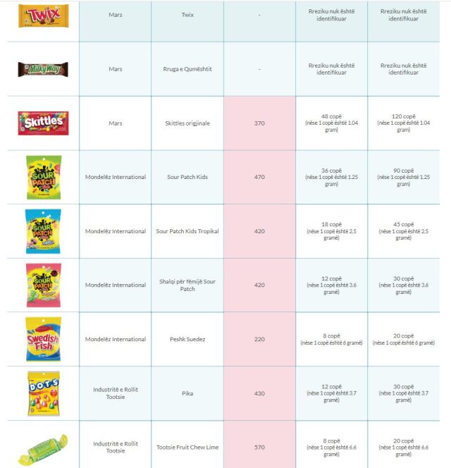 Sipas raportit, nga 48 produkte të testuara, 28 rezultuan me nivele që autorët i përshkruajnë si toksike. Mes ëmbëlsirave të përmendura janë Kit Kat, Snickers, Twix, Original Skittles, Swedish Fish, Sour Patch Kids dhe Tootsie Roll.