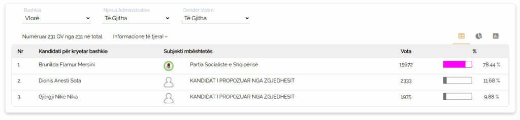 Në Vlorë, ku u regjistrua edhe pjesëmarrja më e ulët në shkallë vendi me vetëm 12.5% të votuesve, fitoren e thellë e siguroi kandidatja e Partisë Socialiste, Brunilda Mersini.
