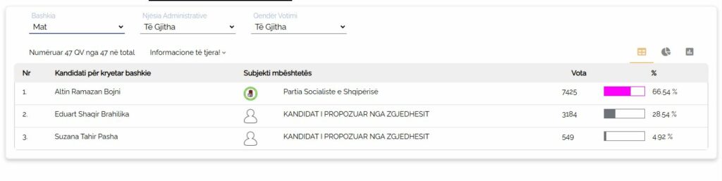 Procesi i numërimit ka përfunduar edhe në Mat. Kandidati socialist Altin Bojini ka fituar bindshëm me 66.54% (7 mijë e 425 vota), ndërsa kandidati i pavarur i mbështetur nga PD, Eduart Brahilika, ka marrë 28.54% (3 mijë e 184 vota). Kandidatja e pavarur Suzana Pasha, e cila garoi kundër partisë së saj, PS, ka marrë deri më tani 4.92% (549 vota).