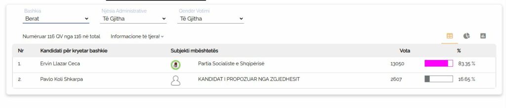 Në Berat, diferenca mes kandidatëve ishte edhe më e thellë. Socialisti Ervin Ceca siguroi 13 mijë e 050 vota ose 83.35%, përballë Pavlo Shkarpës, kandidatit të mbështetur nga PD, i cili mori vetëm 2 mijë e 607 vota (16.65%). Krahasuar me zgjedhjet e majit, PS rritet me 28%, ndërsa PD pëson një tkurrje prej 16.75%.