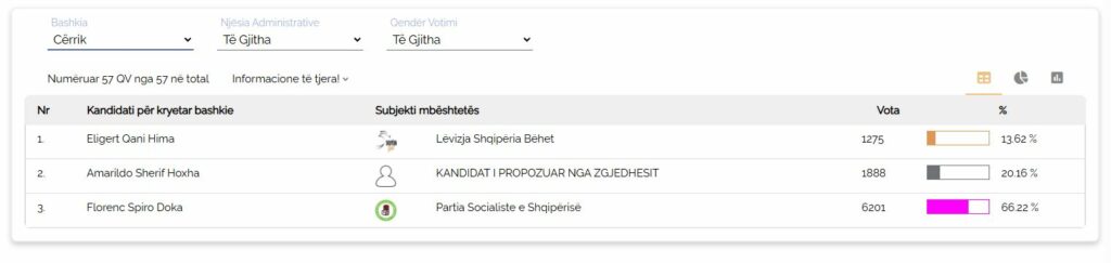 Edhe në Cërrik, rezultati ka qenë në favor të PS-së. Kandidati socialist Florenc Doka fitoi me 66.22% (6 mijë e 201 vota), duke lënë pas kandidatin e mbështetur nga PD, Amarildo Hoxha, me 1 mijë e 888 vota, dhe Eligert Himën nga “Shqipëria Bëhet” me 1 mijë e 275 vota. Krahasuar me zgjedhjet e mëparshme, PS rritet me 6.72%, ndërsa PD humbet 9.14% të mbështetjes.