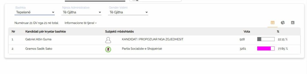 Në Tepelenë, ku për herë të parë u testua numërimi paralel i votave me Inteligjencë Artificiale, kandidati socialist Gramos Sako fitoi me 77.85% (3 mijë e 261 vota). Rivali i tij, i mbështetur nga opozita, Gabriel Guma, mori 928 vota. PS shënon një rritje prej 9.5%, ndërsa PD një rënie të lehtë prej 1%.