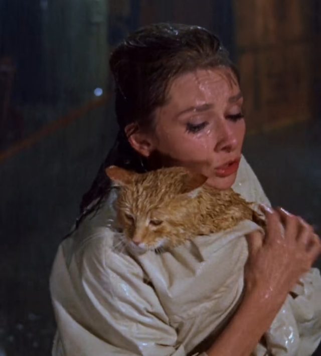Në planin narrativ, skena ka një peshë të fortë simbolike: Holly këmbëngul se as ajo dhe as macja “nuk i përkasin askujt”, por akti i braktisjes në shi pasqyron frikën e saj nga lidhja dhe përgjegjësia. Kthimi i saj në shi për ta gjetur macen shënon momentin e ndryshimit emocional, ku ajo pranon se dashuria dhe përgjegjësia janë zgjedhje — jo pranga. Finalja, me përqafimin në rrugicë, e bën macen katalizatorin e transformimit të personazhit dhe një nga elementët më të paharrueshëm të filmit.