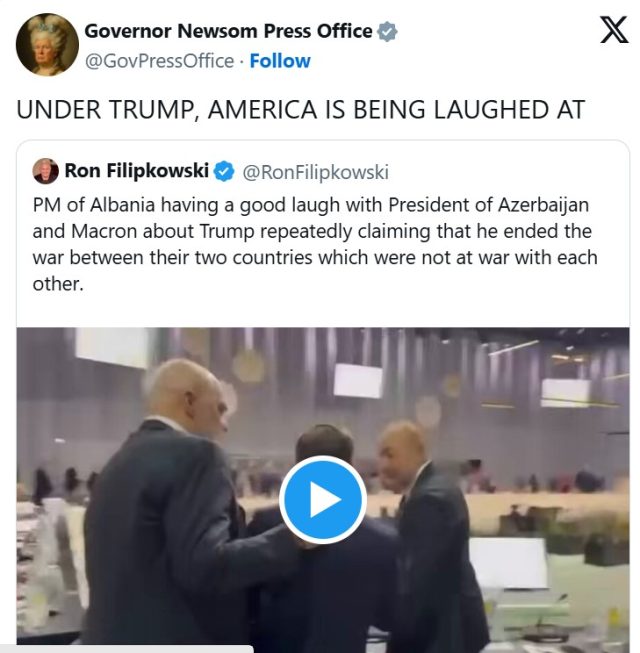 Llogaria zyrtare në platformën X e Guvernatorit të Kalifornisë, Gavin Newsom, ka publikuar një video që po bën xhiron e rrjeteve sociale, ku shfaqet një moment ironik mes liderëve evropianë gjatë samitin të Kopenhagenit. Në video, kryeministri shqiptar Edi Rama shihet duke bërë një batutë lidhur me ngatërrimin e vendeve Shqipëri dhe Armeni nga ish-presidenti amerikan Donald Trump, çka shkakton të qeshura te presidenti i Azerbajxhanit dhe Emmanuel Macron.