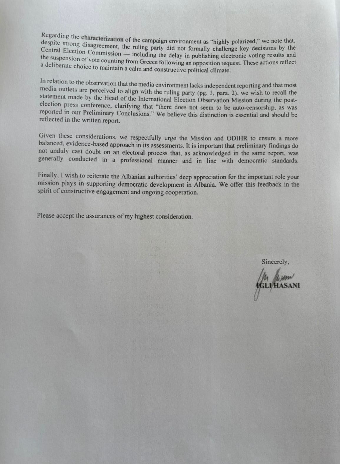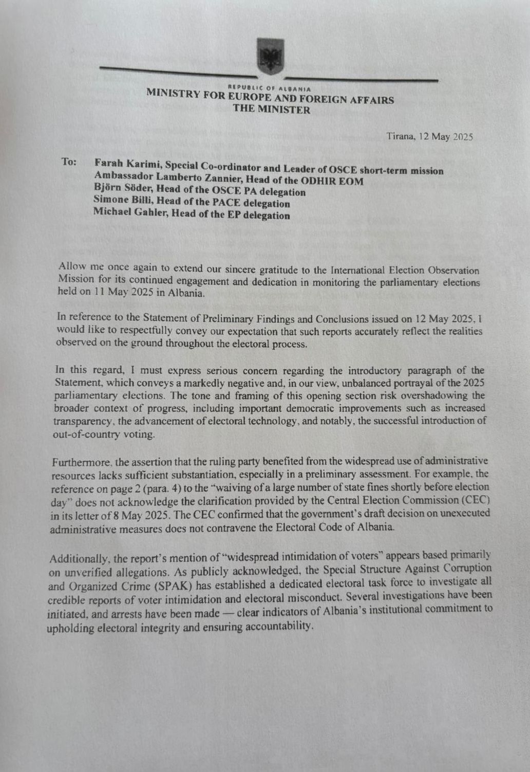 Sipas Berishës, letra është dërguar nga ministri i Jashtëm, Igli Hasani, menjëherë pas publikimit të raportit paraprak të OSBE/ODIHR mbi zgjedhjet e 11 majit, dhe i drejtohet përfaqësuesve më të lartë të misionit ndërkombëtar të vëzhguesve. Në të, ministri shpreh “pritshmërinë që raportet të pasqyrojnë me saktësi realitetet e observuara” dhe ngre “shqetësime serioze” lidhur me përmbajtjen e paragrafit hyrës të deklaratës, i cilësuar si “thellësisht negativ dhe i pabalancuar”.