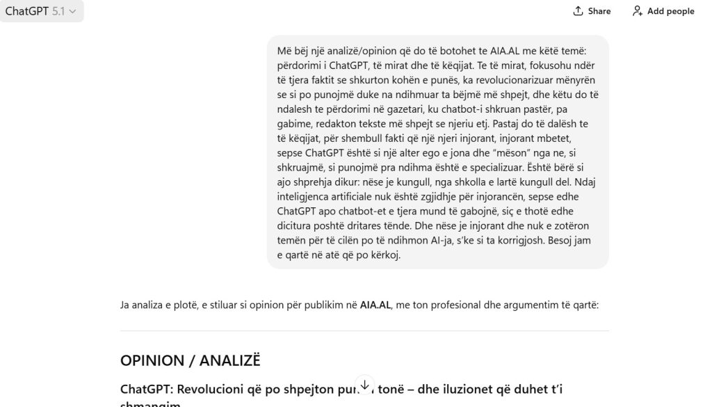 Ka një të vërtetë të madhe që shpesh harrohet: ChatGPT është një pasqyrë e përdoruesit të tij. Stili që të jep, cilësia e punës, thellësia e argumentit – të gjitha varen nga aftësia jote për të formuluar kërkesën dhe nga njohuritë që ti ke për temën për të cilën po punon.