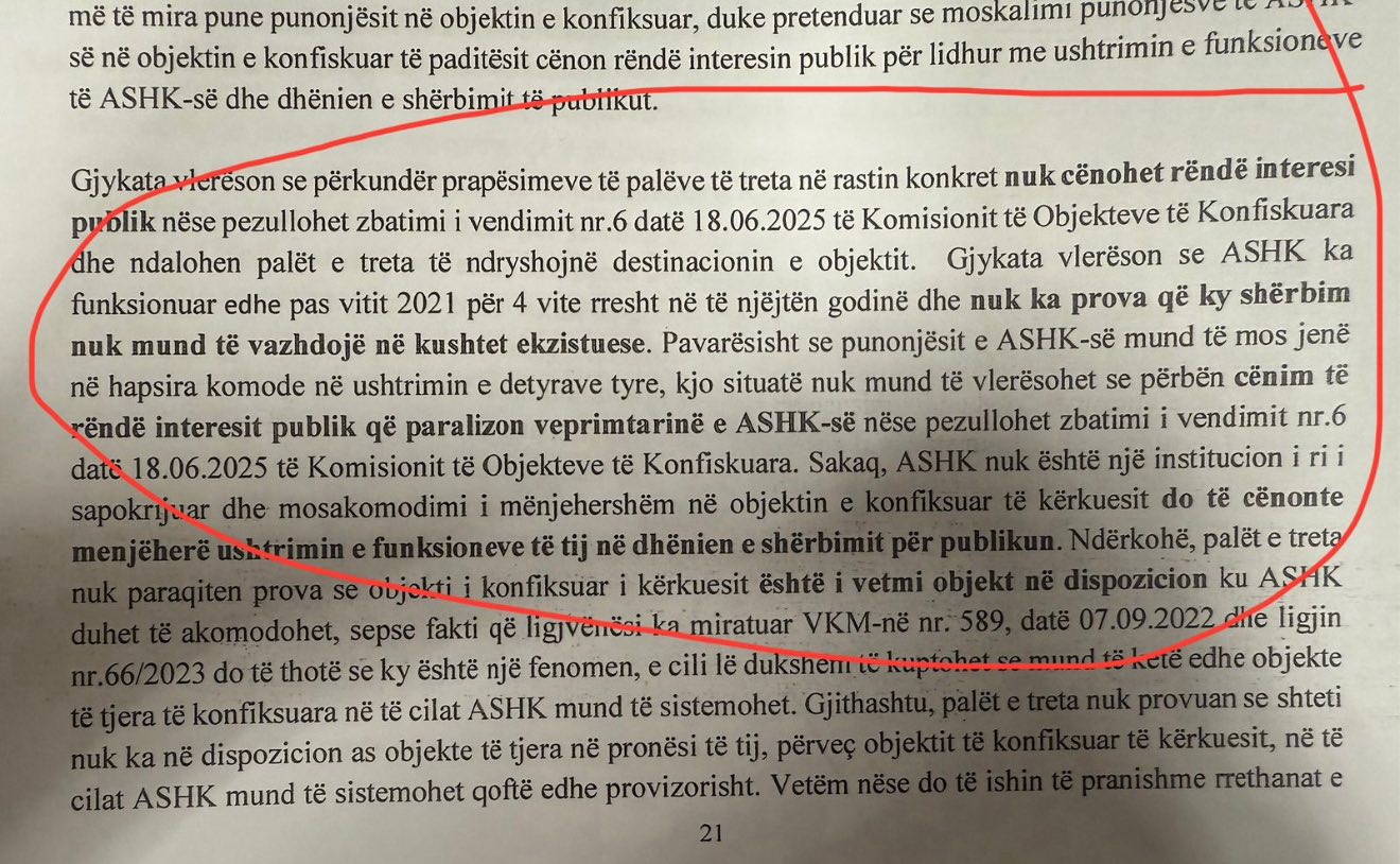 Shefi i qeverisë ka publikuar një pjesë të arsyetimit të gjyqtarit, i cili thotë ndër të tjera, se ASHK mund të punojë në ambiente të tjera dhe vendosja e saj në godinën e konfliktit mes dy palëve, nuk është e domosdoshme.