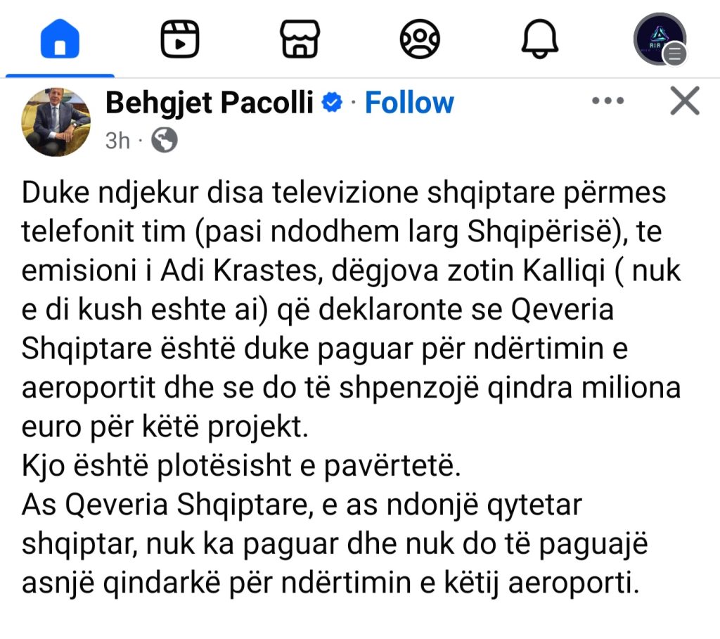 “As Qeveria Shqiptare, e as ndonjë qytetar shqiptar, nuk ka paguar dhe nuk do të paguajë asnjë qindarkë për ndërtimin e këtij aeroporti. Ndërtimi financohet plotësisht nga koncesionari,” – shkruan Pacolli.