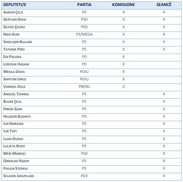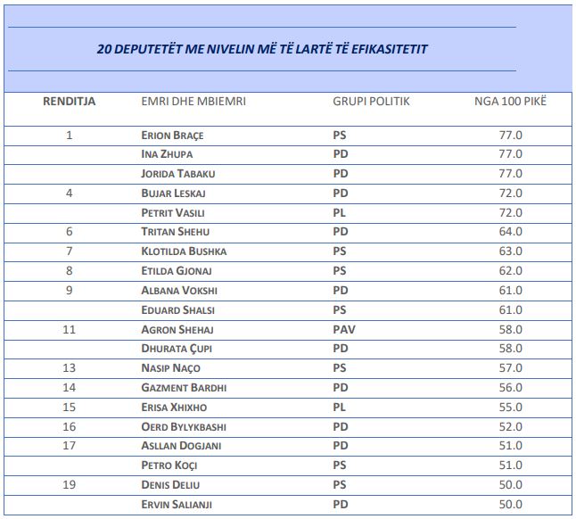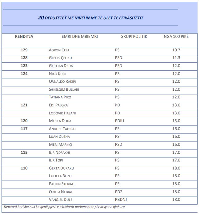 Agron Çela i PS, Gledis Çeliku i PSD, Gertjan Deda i PSD, Niko Kuri PS/MEGA, Orlando Rakipi i PS, Shkëlqim Bullari i PS dhe Tatiana Piro e PS janë 7 deputetët që kryesojnë listën e 7ligjvënësve me efikasitetin më të ulët në Kuvend. Të cilët janë vlerësuar me më pak se 19 pikë nga Instituti i Studimeve Politike. Nga lista përjashtohet ish-kryeministri Sali Berisha, i cili nuk merr pjesë në seancat plenare për shkak se ndodhet në arrest shtëpie për aferën Partizani, ndërsa mandati i tij i deputetit nuk është djegur.