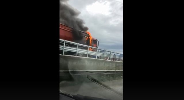 Një kamion është përfshirë nga flakët mëngjesin e kësaj të mërkure në autostradën Tiranë – Durrës, në afërsi të mbikalimit të Rinasit.