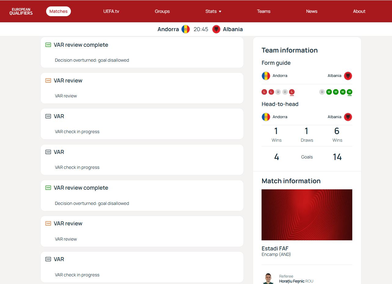 Ndeshja mes Andorrës dhe Shqipërisë do të luhet sot në orën 20:45. Por si për çudi, UEFA e ka nisur ndeshjen që katër orë përpara orarit zyrtar në faqen e saj të internetit.