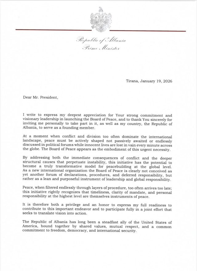 Në letrën zyrtare drejtuar Presidentit amerikan, Kryeministri shpreh mirënjohjen për ftesën personale dhe për përfshirjen e Republikës së Shqipërisë si anëtare themeluese e Bordit të Paqes, duke e cilësuar nismën si një instrument të domosdoshëm në një kohë kur konfliktet dhe përçarjet dominojnë skenën ndërkombëtare.