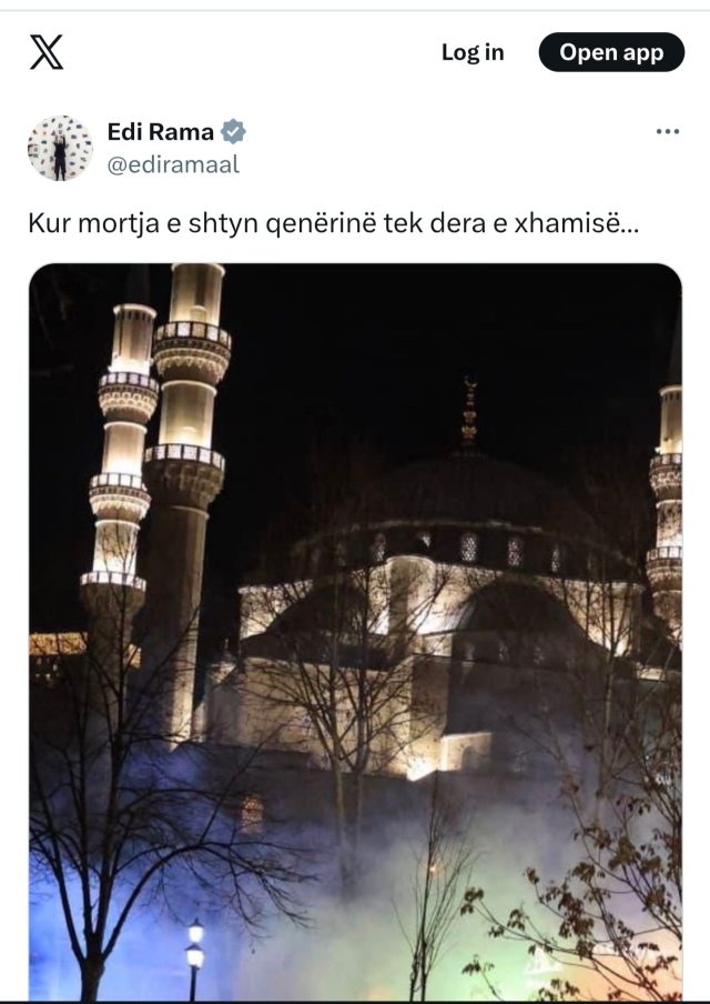 Në postimin e tij, Rama shkruan: “Kur mortja e shtyn qenërinë tek dera e xhamisë…”, duke shoqëruar mesazhin me një foto nga ambientet pranë një xhamie, ku duken re tymi.
