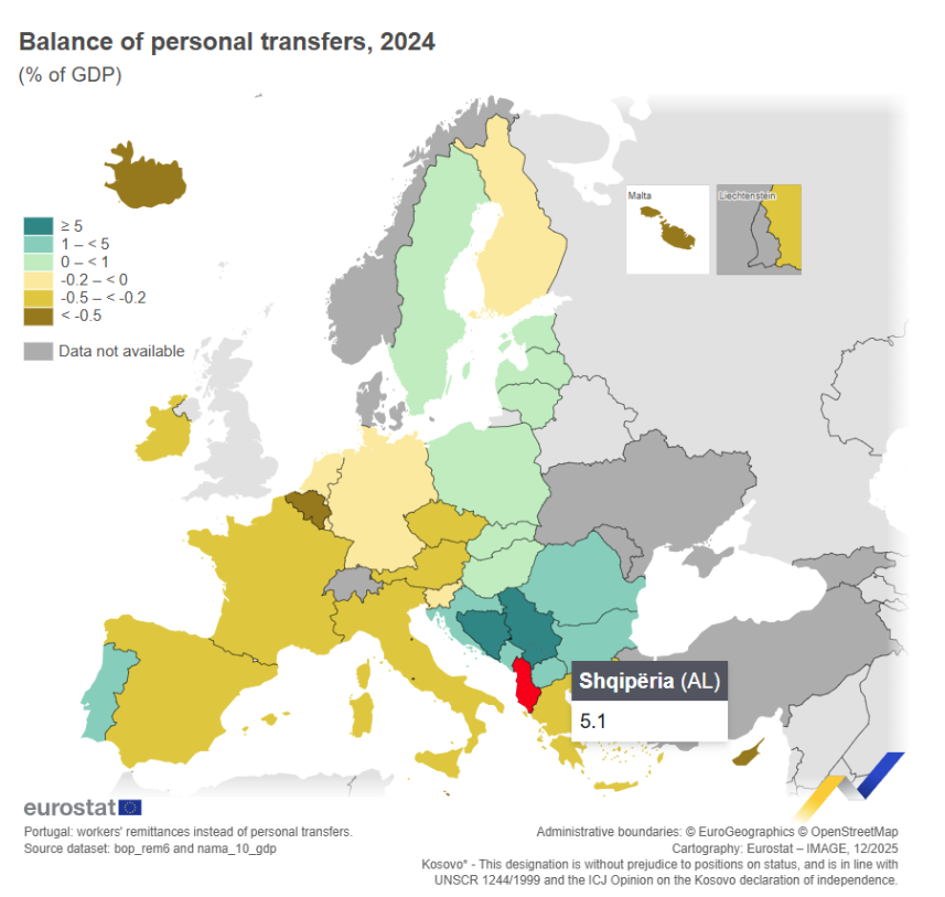 Eurostat sqaron se treguesi përfshin kryesisht dërgesat e emigrantëve drejt familjeve të tyre, si dhe pagat e punonjësve që punojnë përkohësisht jashtë vendit të rezidencës, duke e bërë këtë statistikë një pasqyrë të rëndësishme të lëvizjes së punës dhe të lidhjeve ekonomike mes vendeve europiane dhe pjesës tjetër të botës./Monitor.