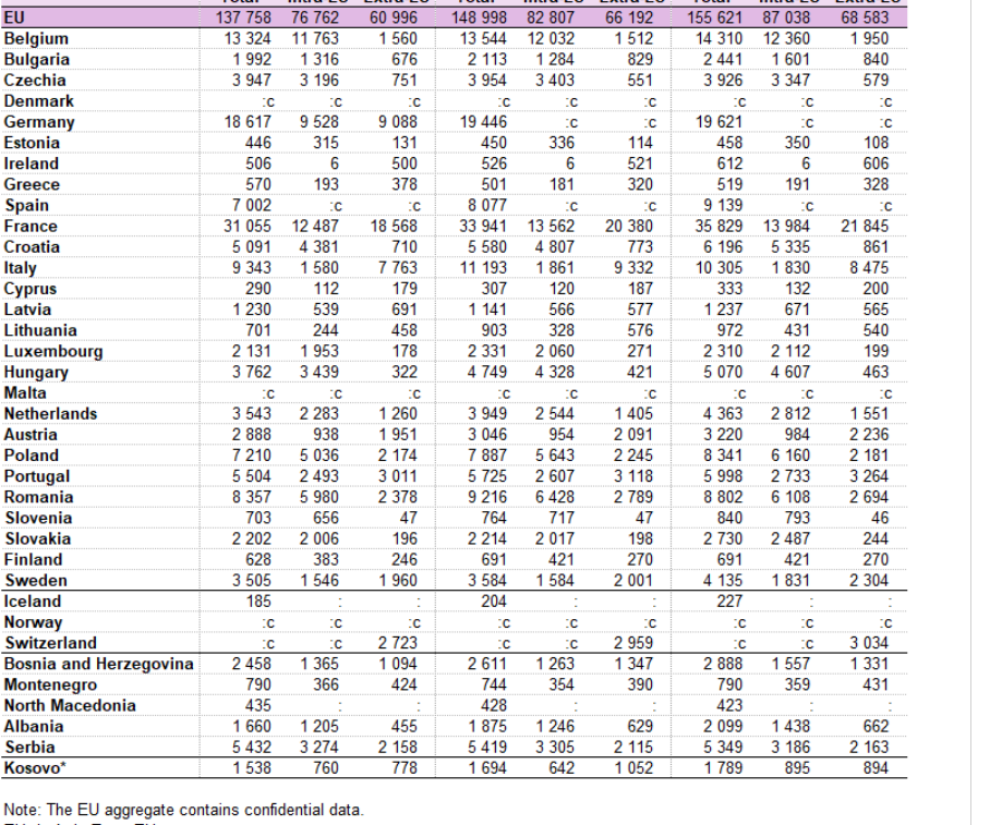 Sipas njoftimit më të fundit të Eurostat, vendet e Bashkimit Europian kanë regjistruar edhe në vitin 2024 flukse të larta të transfertave personale dhe kompensimit të punonjësve, duke reflektuar lëvizjet e fuqisë punëtore brenda dhe jashtë BE-së. Në nivel të BE-së, totali i këtyre hyrjeve arriti rreth 155.6 miliardë euro, nga të cilat 87 miliardë euro erdhën nga vende brenda Unionit dhe 68.6 miliardë euro nga vende jashtë BE-së.