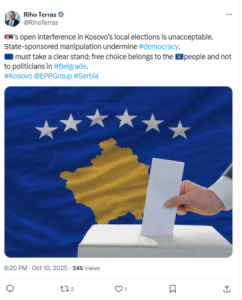 Eurodeputeti Riho Terras përmes një postimi ne “X” ka thënë se ndërhyrja e hapur e Serbisë në zgjedhjet lokale të Kosovës është e papranueshme.
