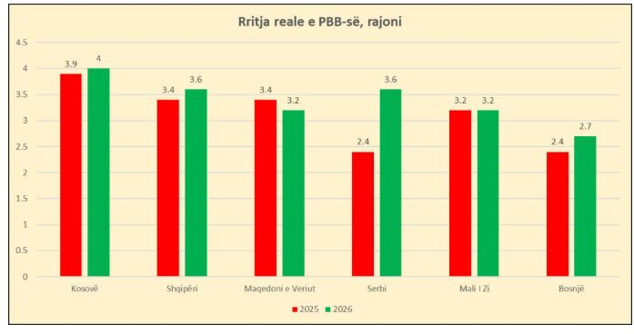 Inflacioni mesatar vjetor pritet të rritet lehtë në 2.3%, nga 2.2% që ishte në 2024-n dhe të kërcejë në 2.8% në 2026-n. Në rajon, rritjen më të lartë pritet ta ketë Kosova, me 3.9% në 2025-n dhe 4% në 2026-n.