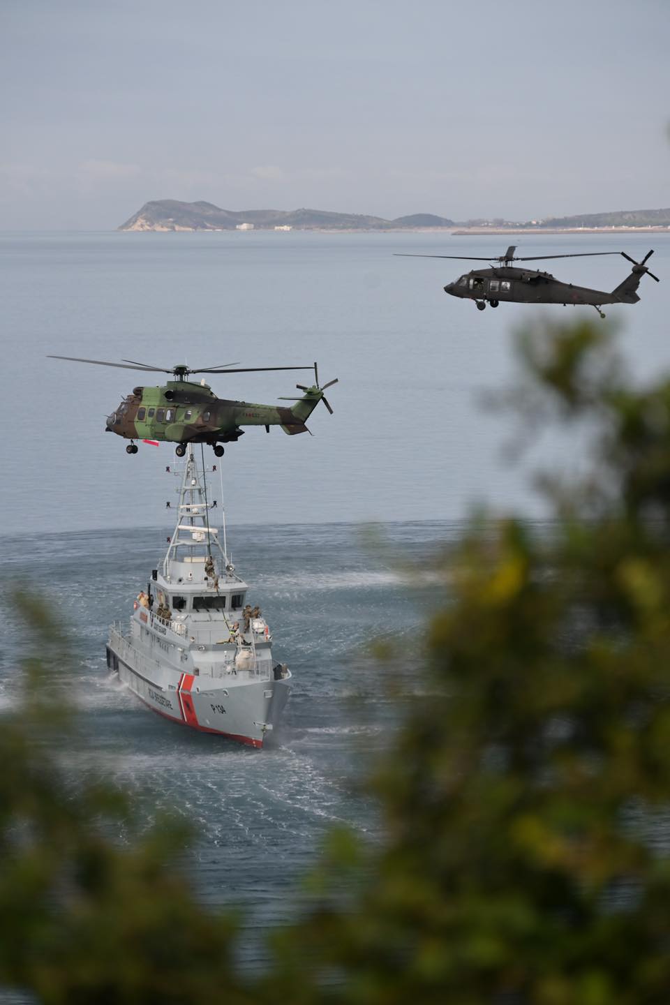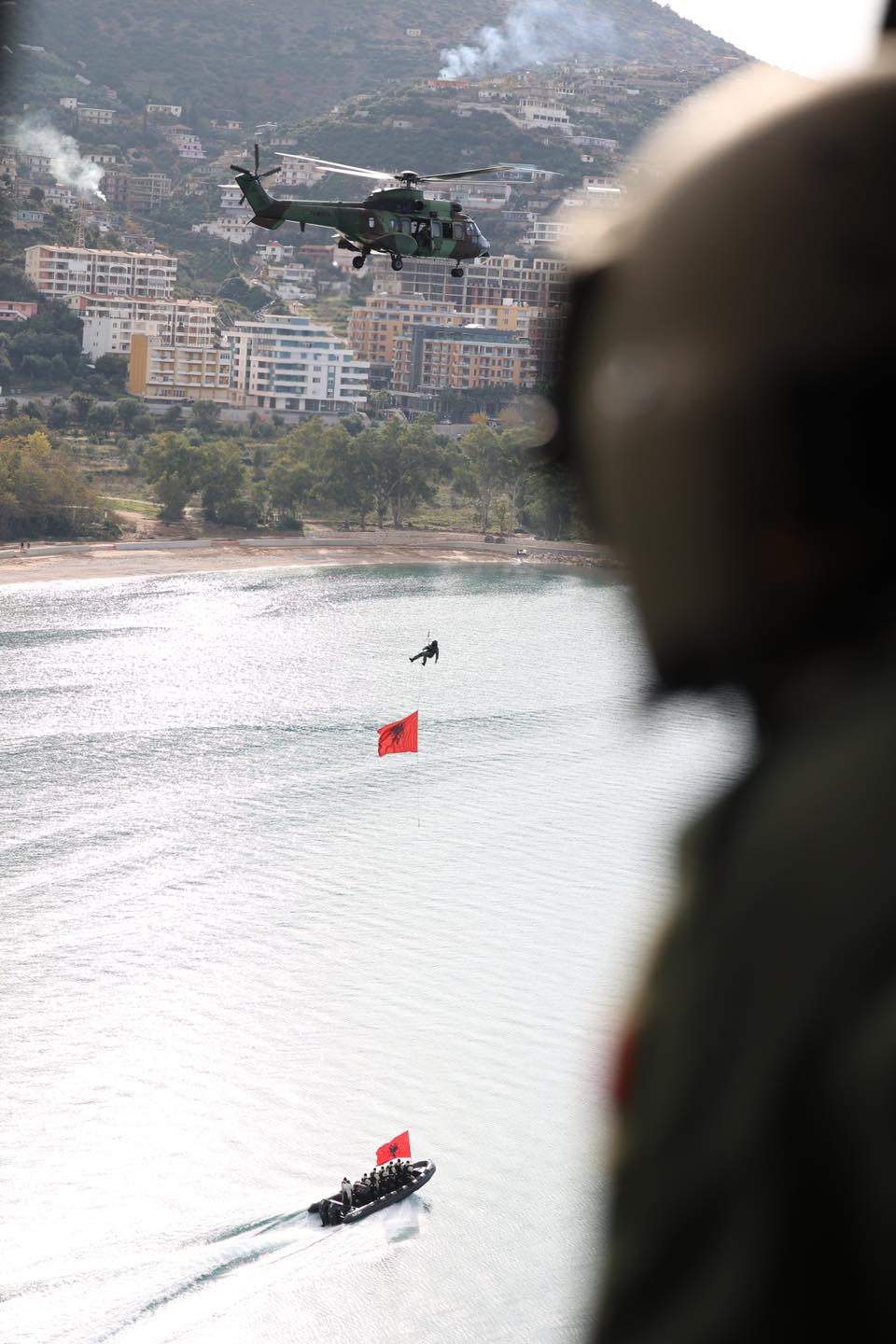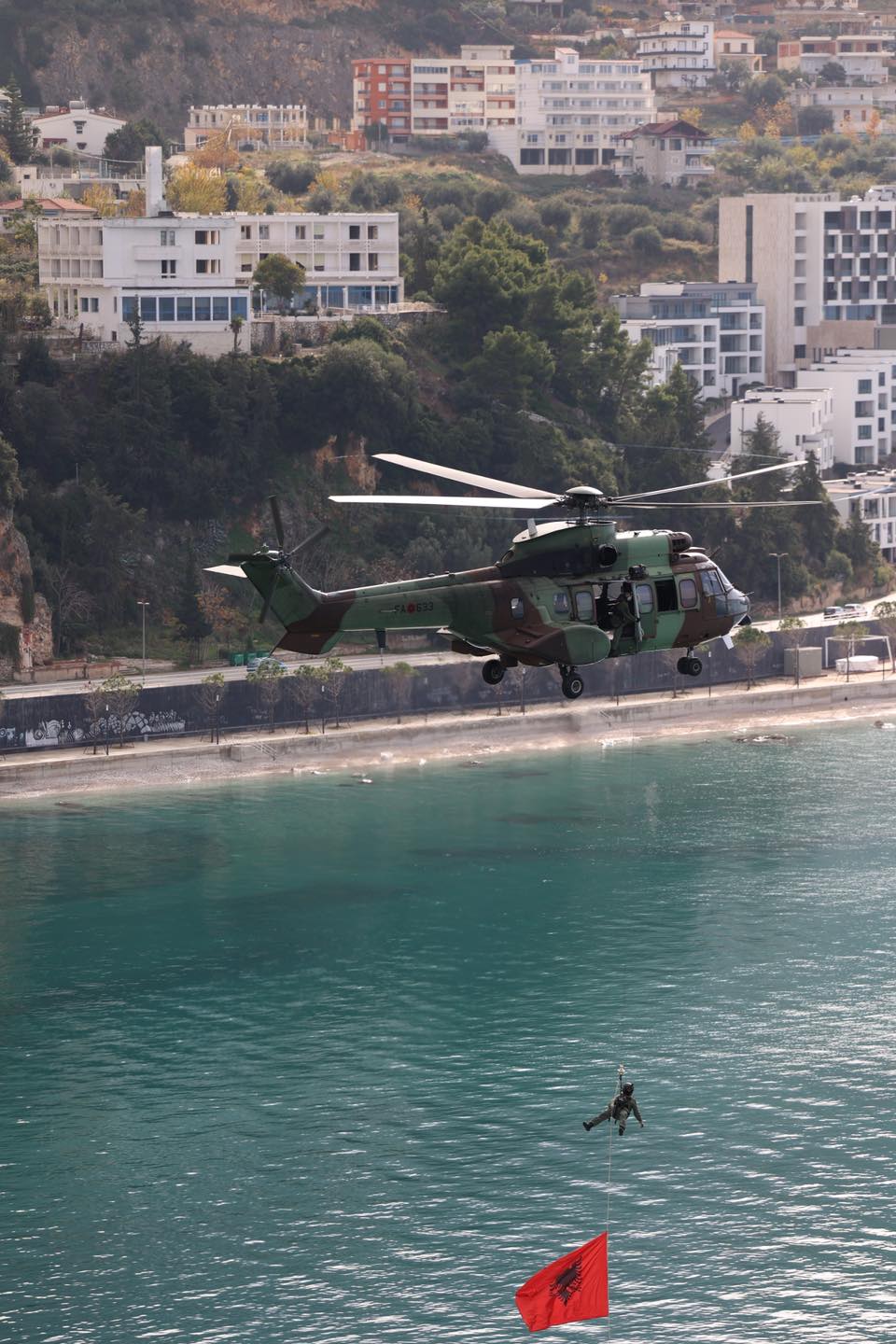 Mijëra qytetarë të mbledhur në Sheshin e Flamurit, por edhe ata nga Lungomare, deri në Orikum, dëshmuan aftësitë dhe kapacitetet e trupave elitarë të Forcave tona të Armatosura , të cilët demonstruan në Gjirin e Vlorës edhe një operacion për marrjen nën kontroll të një anijeje të dyshuar, duke ndërhyrë nga deti me grupet e bordingut dhe ajri me trupat specialë dhe helikopterët Cougar e Black Hawk.