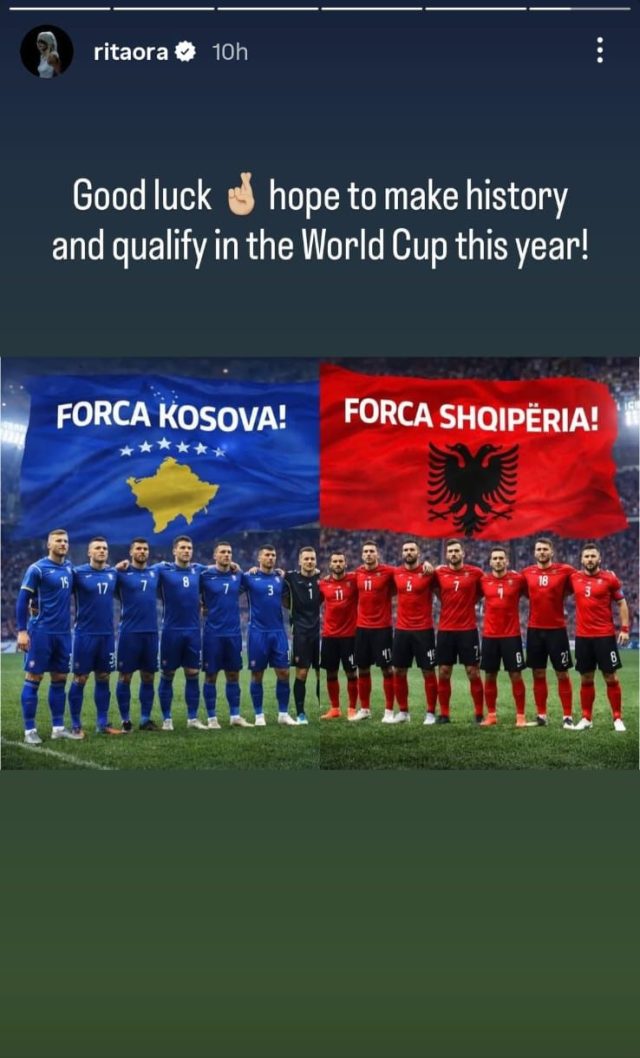 Këngëtarja me famë botërore Rita Ora ka dhënë mbështetjen e saj për Kombëtaren e Shqipërisë dhe atë të Kosovës në prag të ndeshjeve vendimtare të play-off-it për Botërorin. Përmes një postimi në Instagram, ajo u ka uruar fat futbollistëve, duke i nxitur të bëjnë histori.