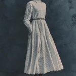 Korsetë, krinolina (Një strukturë e brendshme (si skelet) e bërë nga tela ose materiale të forta, që vendoset nën fustan për t’i dhënë volum dhe formë të gjerë), merleqe ( Dantella e hollë, shpesh e bardhë, e përdorur si dekorim në jakë, mëngë, funde ose aksesorë)– të ndërthurura me silueta moderne.