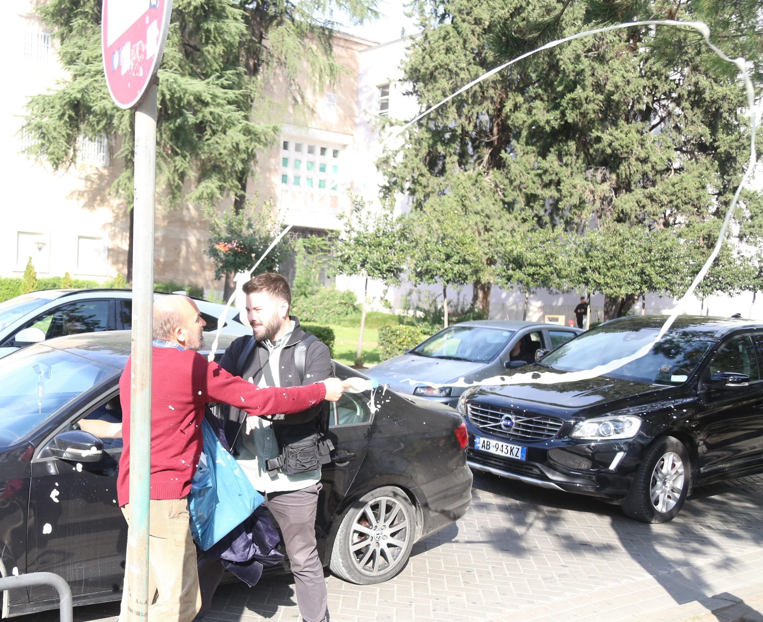 Pas mbledhjes së Eurodeputetëve në Kryesinë e Kuvendit të Shqipërisë, eurodeputeti Fredi Bleri është goditur nga një qytetar me ujë dhe kos.