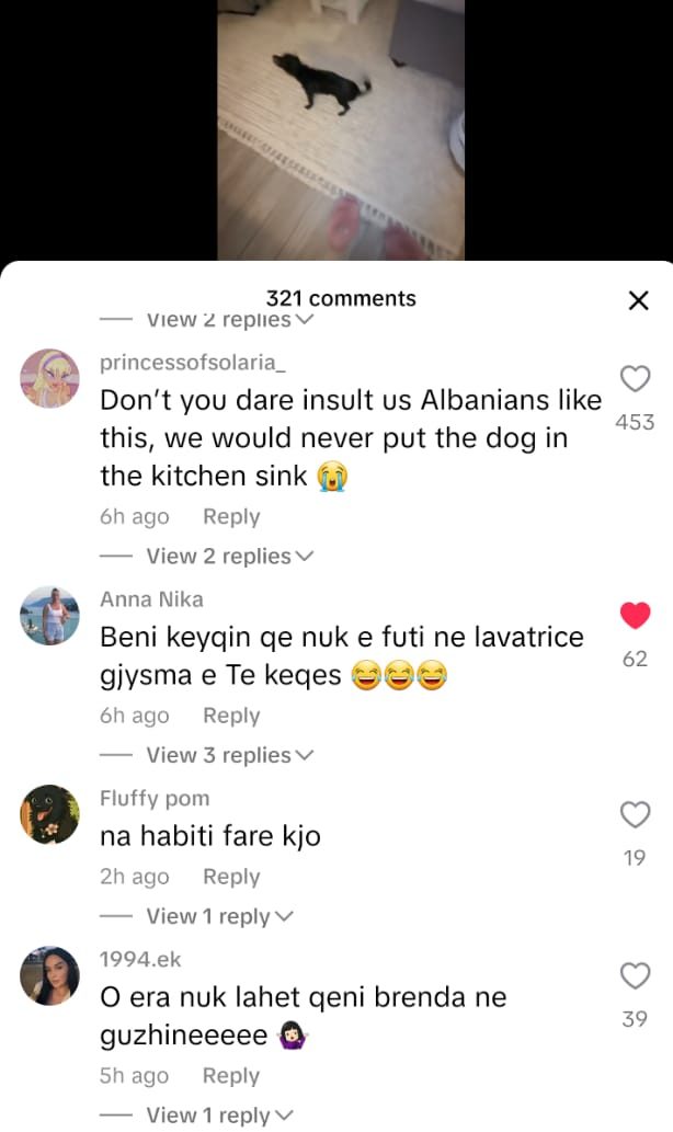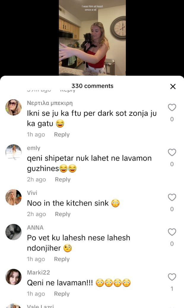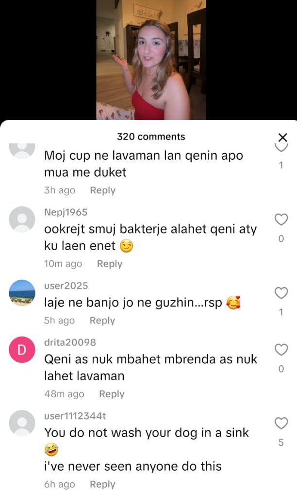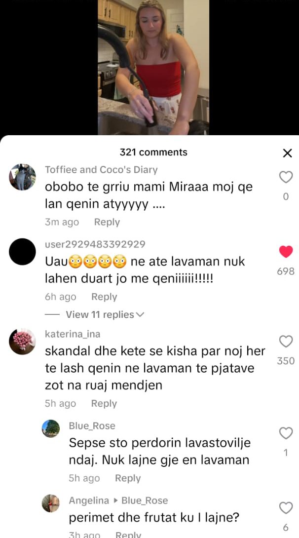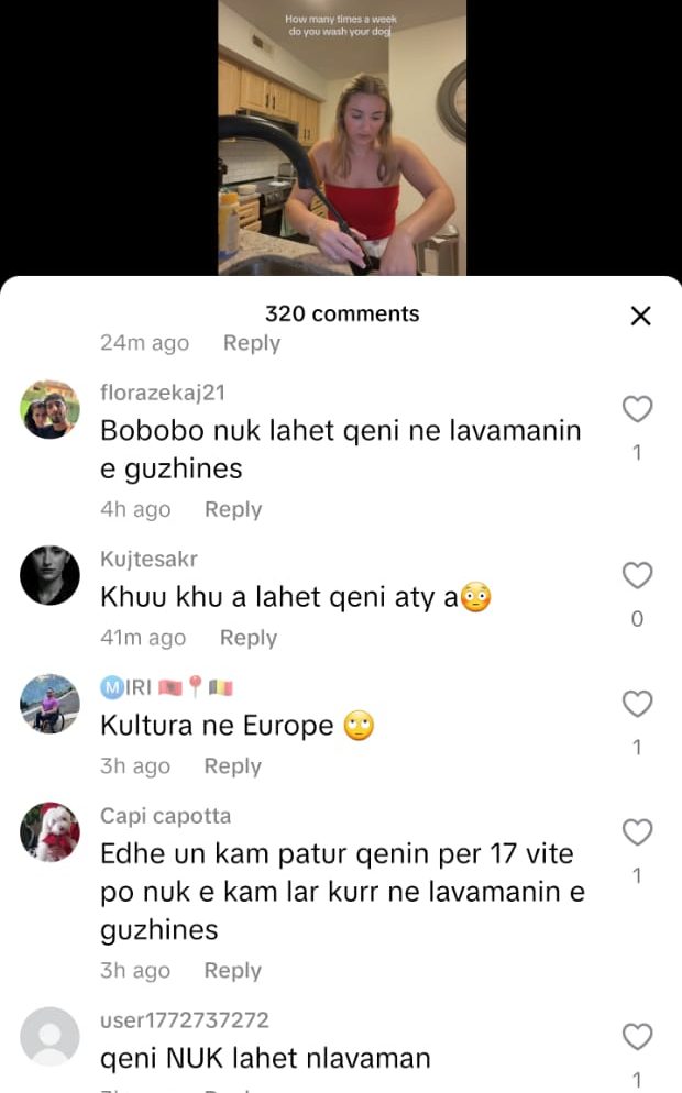 “Moj çupë, në lavaman lan qenin apo enët?”, “Në atë lavaman nuk lahen duart, jo më qeni!”, “Në Evropë qenka kjo kulturë, se këtu do t’kish plasur nami”. Një përdoruese Tik Tok-u shkroi me humor: “Me siguri mami Mira nga Lushnja nuk e ka parë videon, se po ta shohë, plas sherri në shtëpi.”