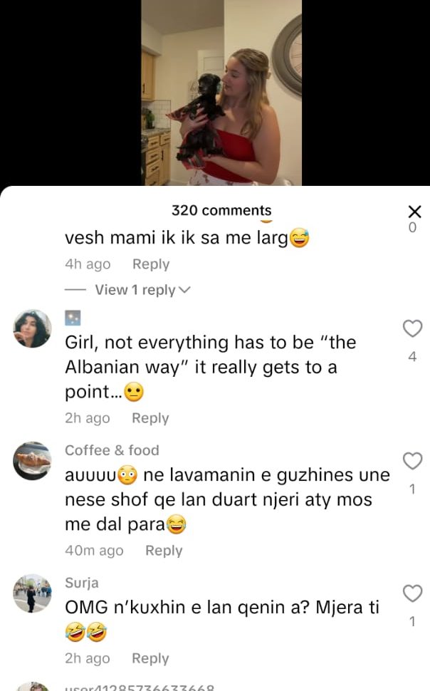 Në një video të publikuar në TikTok, shqiptaro-amerikania Era Kolli shihet duke larë qenin në lavamanin e kuzhinës, teksa tregon me krenari se “shqiptarët janë aq të pastër, sa edhe qenin e lajnë çdo javë”.