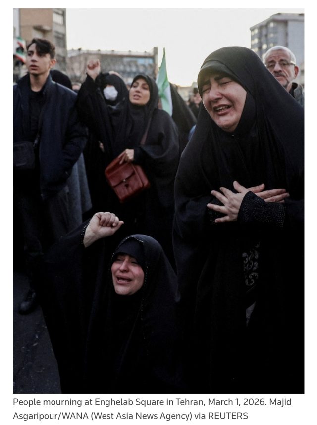 Sipas raportimit të Reuters, në Teheran mijëra qytetarë u mblodhën në sheshin Enghelab, të veshur me të zeza, duke qarë dhe duke kërkuar hakmarrje ndaj SHBA-së dhe Izraelit. Televizioni shtetëror e njoftoi vdekjen me tone emocionale, duke konfirmuar se Khamenei u vra gjatë sulmeve të përbashkëta amerikano-izraelite.