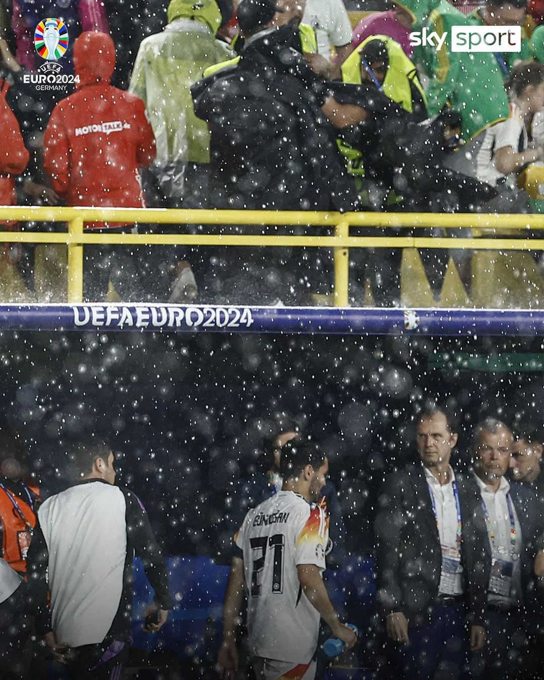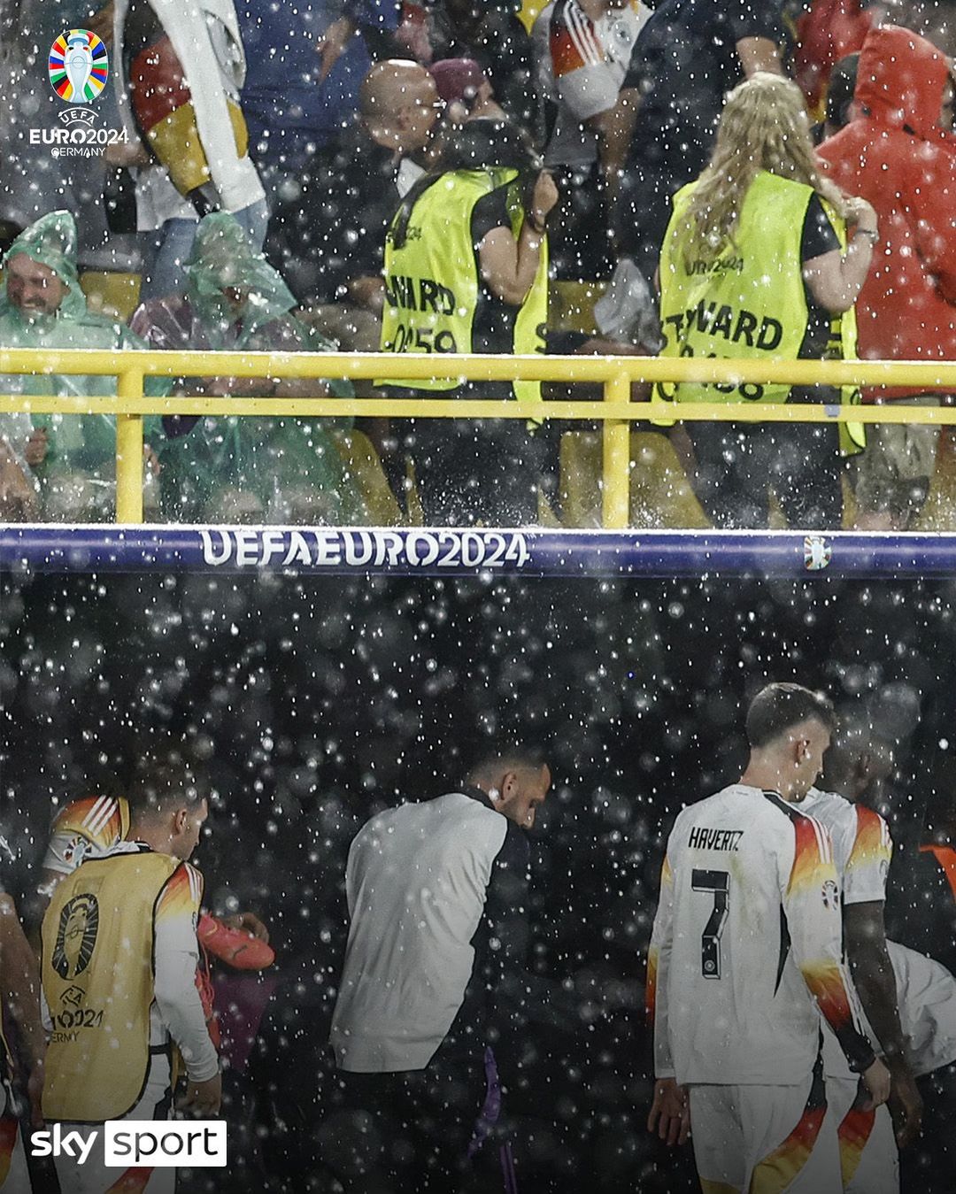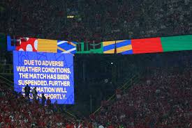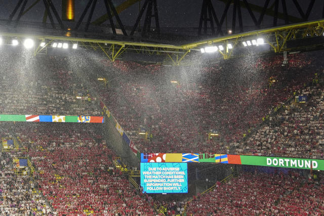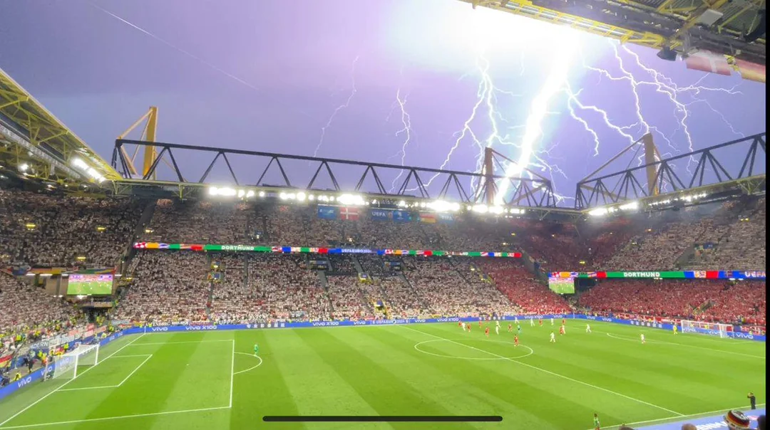 Ndeshja mes Gjermanisë dhe Danimarkës në Dortmund e cila perfundoi 2-0 per organizatoret u ndërpre nga vetëtimat,breshri dhe shiu i dendur në stadiumin.
