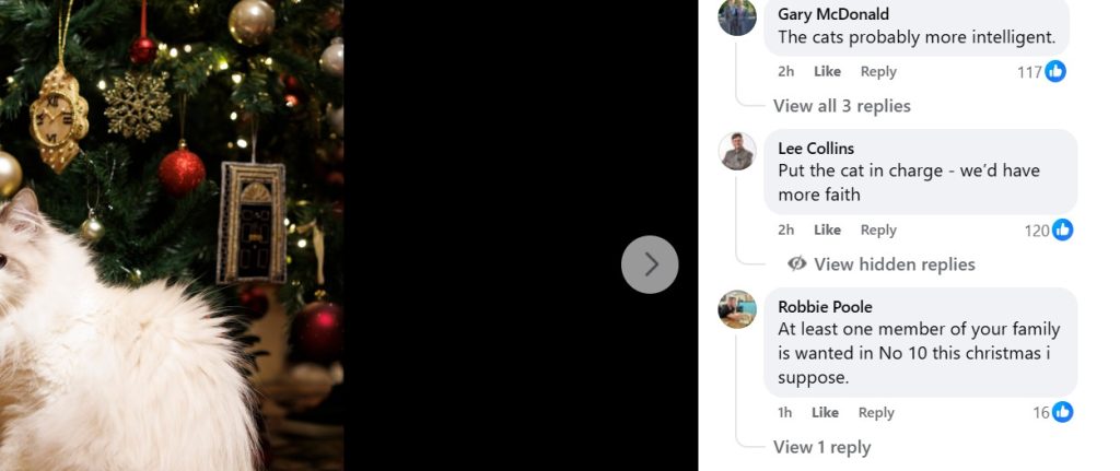 Fotoja është shpërndarë gjerësisht online, ku përdoruesit kanë komentuar me humor dhe simpati, duke e kthyer macen e familjes Starmer në një simbol të vogël të festave të këtij fundviti dhe duke nxitur dhjetëra komente epike.