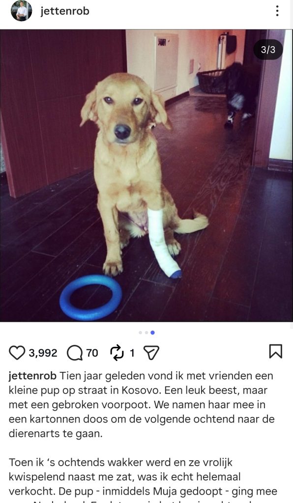 Në fakt, vetë Jetten e ka treguar këtë histori në një postim të bërë në vitin 2023 në Instagram, ku rrëfen se rreth dhjetë vite më parë, gjatë një udhëtimi në Kosovë, gjeti në rrugë një këlysh të vogël me këmbë të thyer.