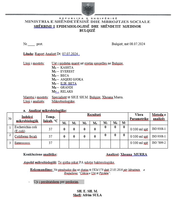 Tashmë, kanë dalë rezultatet e analizave të ujit dhe ka rezultuar pa ndotje bakterologjike.Si pasojë, uji është i përshtatshëm për përdorim. Kjo vërteton që shkak i paraqitjes së qytetarëve në spital nuk është uji i pijshëm, por janë virozat e përhapura.’