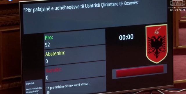 Kuvendi i Shqipërisë miratoi rezolutën “Për pafajësinë e udhëheqësve të Ushtrisë Çlirimtare të Kosovës”, duke riafirmuar qëndrimin institucional në mbështetje të luftës çlirimtare dhe kundërshtimin ndaj akuzave të ngritura nga Dhomat e Specializuara në Hagë.
