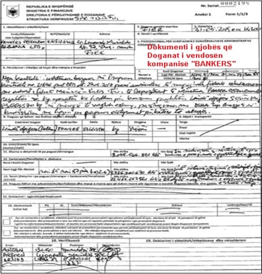 Sipas të dhënave të publikuara, më 31 maj 2019, Dogana i vendosi kompanisë Bankers Petroleum një gjobë prej 84 milionë eurosh për shkelje të rënda doganore, që lidhen me mashtrim të sasive, eksport prodhimi dhe import lëndësh të para. Bankers, sipas raportimeve, nuk kishte paguar akcizë për rreth 15.900 ton hollues nafte, ndërsa në magazinën fiskale rezultonin 83.700 ton pa pagesa doganore. Detyrimi fillestar fiskal llogaritej rreth 27 milionë euro, por pas refuzimit për ta paguar, u aplikua gjoba e plotë.