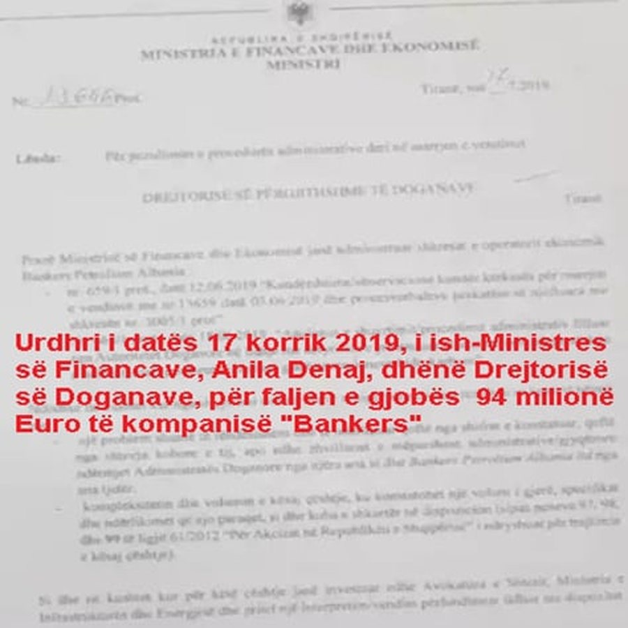 Sipas të dhënave të publikuara, më 31 maj 2019, Dogana i vendosi kompanisë Bankers Petroleum një gjobë prej 84 milionë eurosh për shkelje të rënda doganore, që lidhen me mashtrim të sasive, eksport prodhimi dhe import lëndësh të para. Bankers, sipas raportimeve, nuk kishte paguar akcizë për rreth 15.900 ton hollues nafte, ndërsa në magazinën fiskale rezultonin 83.700 ton pa pagesa doganore. Detyrimi fillestar fiskal llogaritej rreth 27 milionë euro, por pas refuzimit për ta paguar, u aplikua gjoba e plotë.