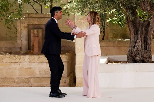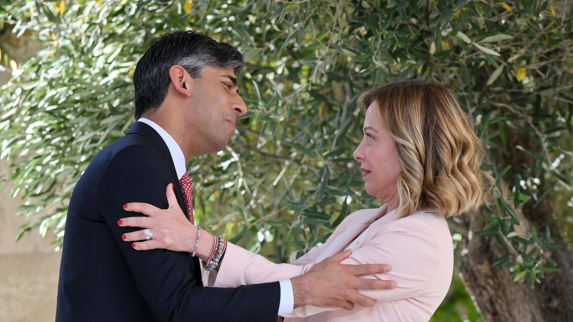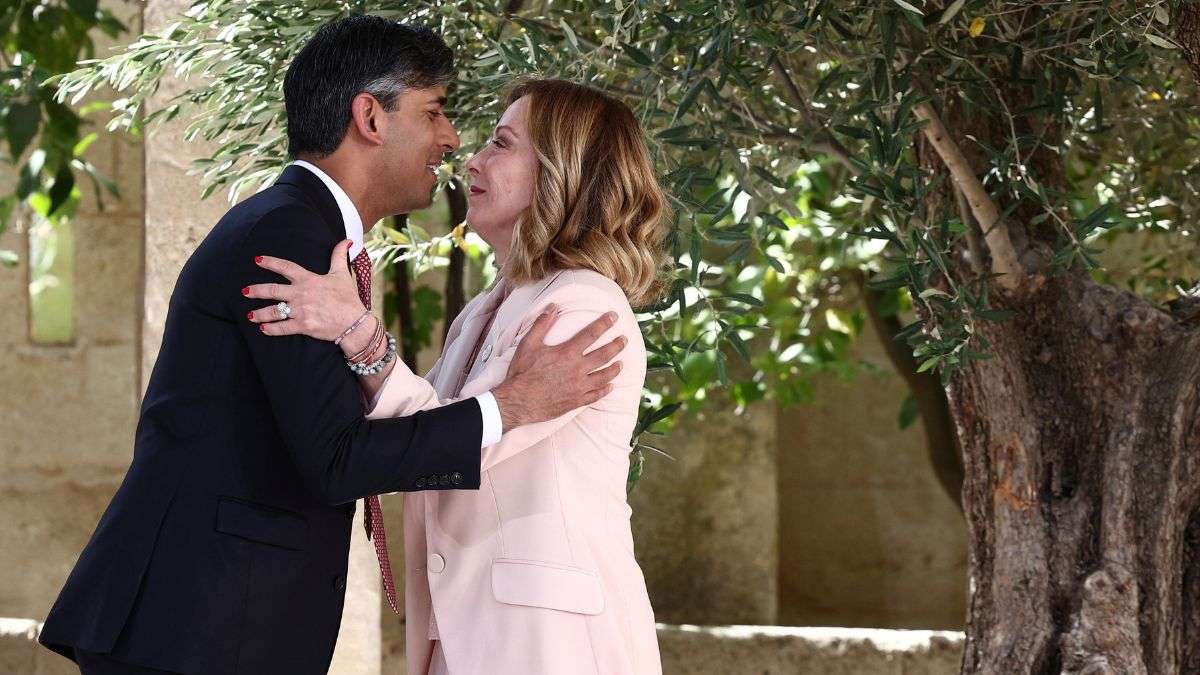 Kryeministri britanik Rishi Sunak dha një shfaqje të papritur për mediat në ceremoninë pritëse të samitit të vendeve të G7 kur takoi homologen italiane Giorgia Meloni.