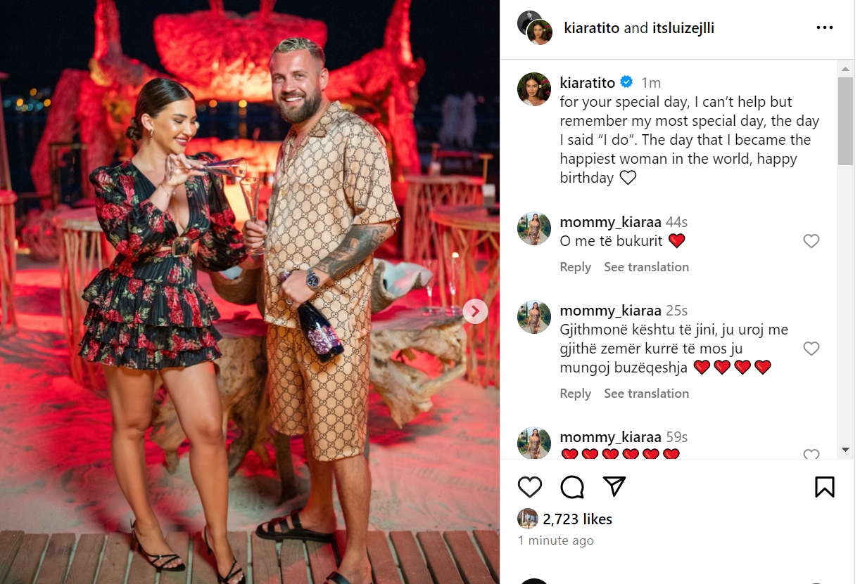 Dhe sot bashkëshortja Kiara e ka uruar pikërisht duke kujtuar ditën kur i tha PO si ditën kur u bëra gruaja më e lumtur në botë shkruan ajo. Mes tyre ka një diferencë moshe prej 11 vjetësh, pasi në janar Kiara mbushi 28 vjeç.
