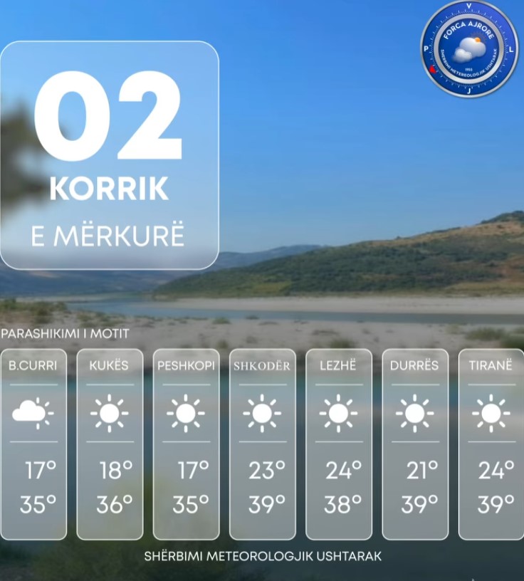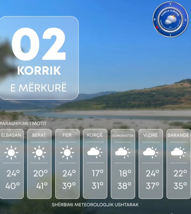 Sipas Shërbimit Meteorologjik Ushtarak, qyteti i Beratit do të shënojë sot temperaturën më të lartë, me termometrin që pritet të arrijë deri në 41 gradë Celsius.