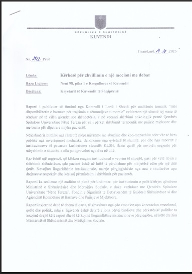 Në kërkesë thuhet se raporti i fundit i Kontrollit të Lartë të Shtetit ka evidentuar situatën e rëndë në të cilën ndodhet sot shëndetësia, veçanërisht shërbimi onkologjik.
