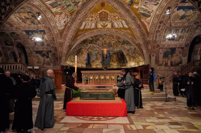 Mbetjet e shenjtorit të shekullit XIII po shfaqen brenda një kutie të mbushur me azot, me mbishkrimin latin “Corpus Sancti Francisci”, në Bazilika e Shën Françeskut të Asizit, ndërtuar në nder të tij.