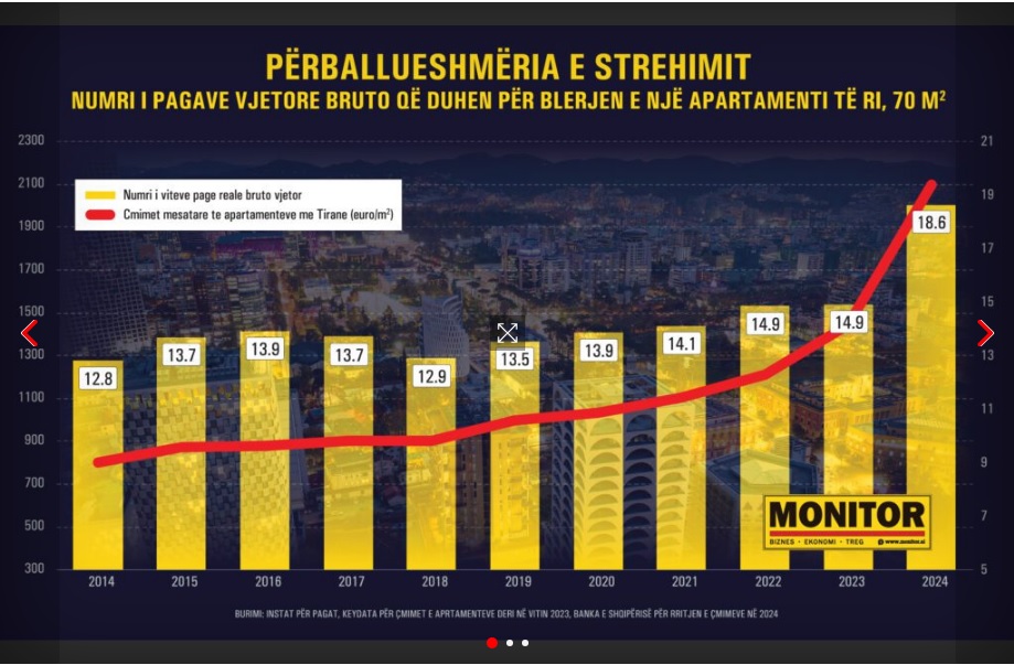 “Monitor” ka përllogaritur treguesin e përballueshmërisë së strehimit, apo aftësisë blerëse për banesë, që mat se sa paga vjetore reale bruto duhen për të blerë një apartament të ri, me një madhësi standarde prej 70 metra katror.