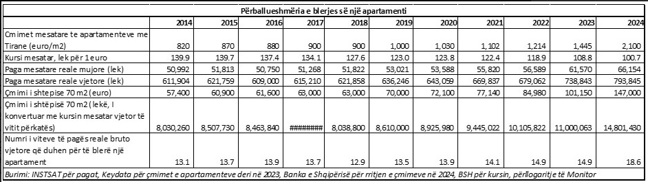 I konvertuar në lekë, një apartament 70 metra katror kushton 14.8 milionë lekë, nga 7.8 milionë lekë një dekadë më parë. Për të blerë këtë apartament tashmë duhen gati 19 paga vjetore reale bruto (18.6), ose gati 6 vite më shumë sesa një dekadë më parë.