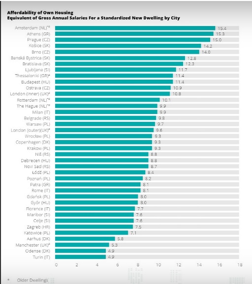 Sipas të dhënave të mbledhura nga zyrat kombëtare të Deloitte, qyteti më pak i përballueshëm në këtë sondazh është Amsterdami, ku banorëve u nevojiten 15.4 paga mesatare bruto vjetore për të blerë një apartament 70 m² – një rritje e lehtë prej 0.3 krahasuar me një vit më parë. Pas tij renditet Athina, me 15.3 paga vjetore, ndërsa në vendin e tretë është Praga, ku duhen 15 paga vjetore për një banesë të ngjashme.