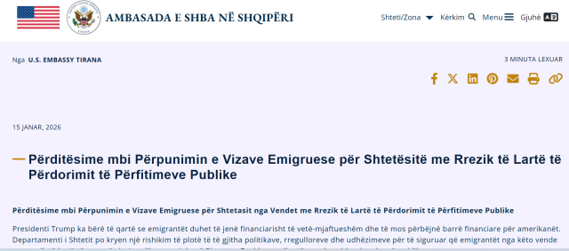 15 Janar 2026 — Departamenti Amerikan i Shtetit ka njoftuar pezullimin e përkohshëm të lëshimit të vizave emigruese për shtetasit e 75 vendeve, mes tyre edhe Shqipëria, në kuadër të një rishikimi të gjerë të politikave të imigracionit të administratës amerikane.