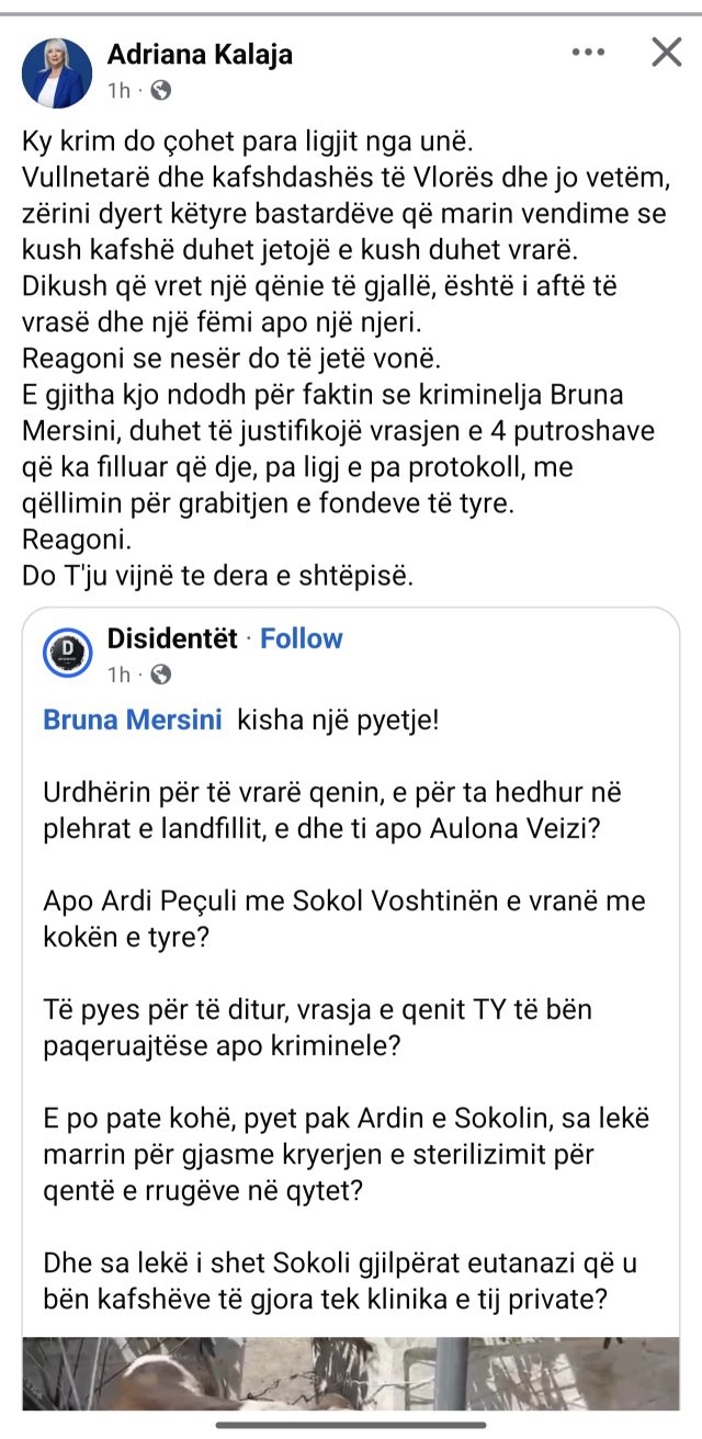 Në të njëjtën linjë, edhe faqja “Disidentët”, e njohur për qëndrimet e saj nga Vlora, ka publikuar akuza të drejtpërdrejta ndaj kryebashkiakes Brunilda Mersini, duke ngritur dyshime për përgjegjësi në trajtimin e rastit dhe për mënyrën si janë menaxhuar qentë endacakë.