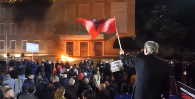 Protestuesit “bombardojnë” kryeministrinë me molotov sapo mbaron fjalimi i ish kryeministrit Sali Berisha.