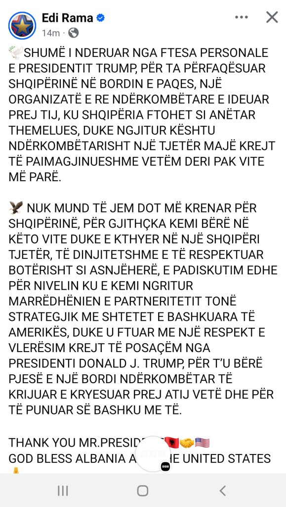 Kryeministri nënvizon se kjo ftesë është edhe një vlerësim i drejtpërdrejtë për nivelin e marrëdhënieve strategjike mes Shqipërisë dhe Shteteve të Bashkuara të Amerikës, duke shtuar se respekti dhe konsiderata nga presidenti Trump janë të posaçme.
