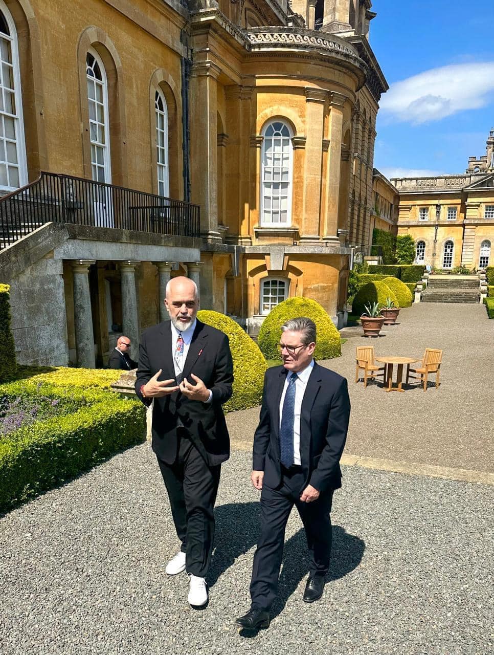 Më herët gjatë ditës u takua me kryeministrin e ri britanik. “Biseda e parë me kryeministrin e sapozgjedhur britanik, Keir Starmer, në një nga parqet e mahnitshme të pallatit ku lindi e kaloi një pjesë të jetës së vet legjendare, paraardhësi i tij Winston Churchill”, ka shkruar Rama.
